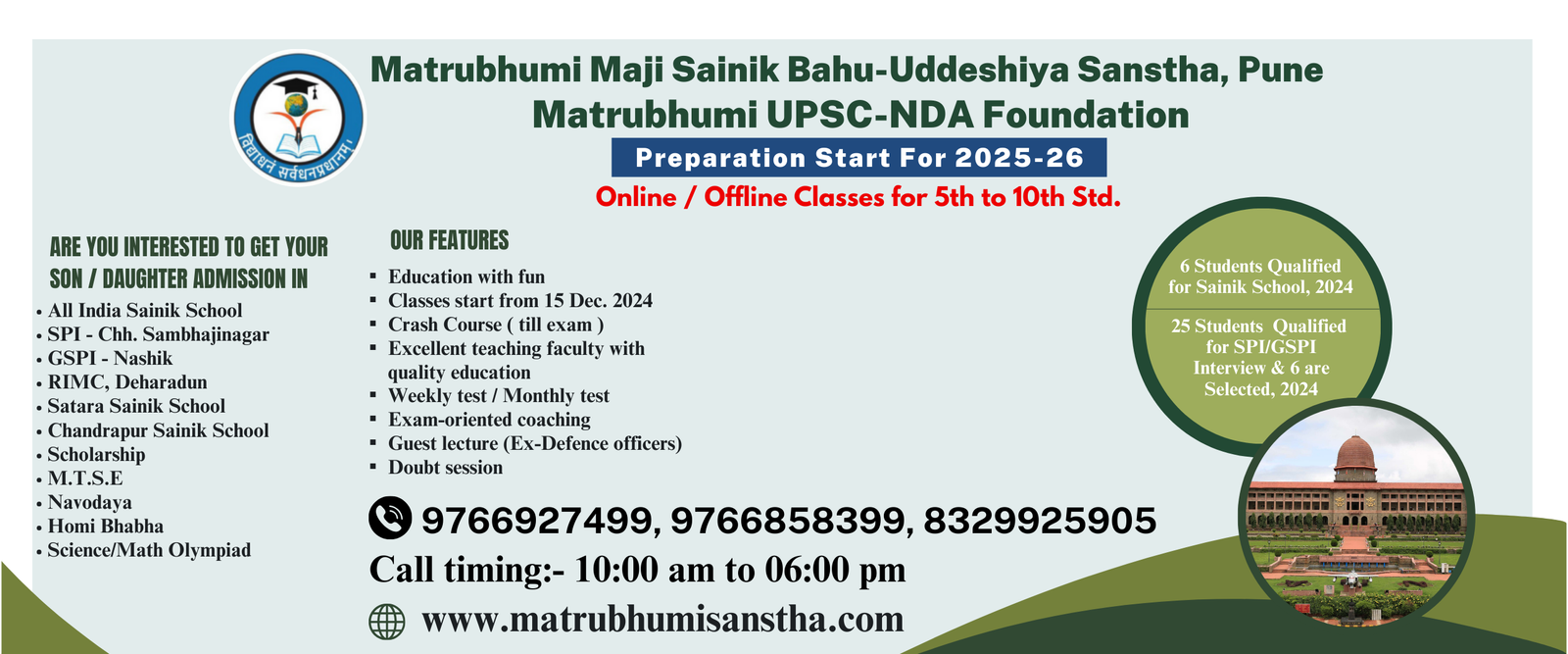 Welcome to Matrubhumi, the leading Defence Career Guidance Institute brought to you by “Matrubhumi Maji Sainik Bahuuddeshiy Sanstha- Pune” Our institute was established by highly educated Ex-servicemen, who have been re-employed in various department , with a strong sense of social responsibility. We are dedicated to providing comprehensive guidance and support to aspiring students who wish to pursue a career in the defence as an officer. We understand the importance of nurturing young minds and helping them realize their dreams of serving the nation through a career in defence.